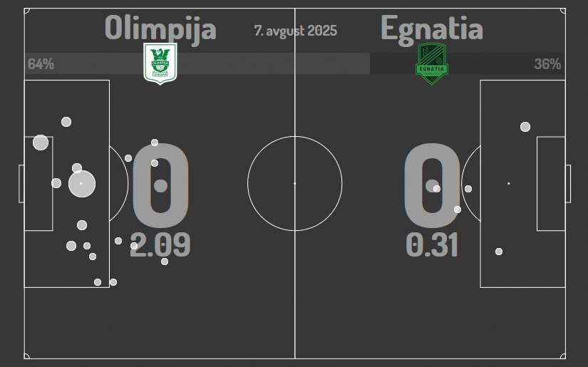Olimpija je povsem nadigrala Egnatio, kar se lepo pokaže na zemljevidu strelov. Medtem, ko so gostje znotraj kazenskega prostora poskusili zgolj dvakrat, je to nogometašem Olimpije uspevalo zelo pogosto.