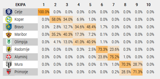 Šest kol pred koncem je računalnik s pomočjo 10.000 simulacij izračunal, da bo Celje prvak s 100% možnostjo. Za drugo mesto najboljše kaže Kopru, za preostalo evropsko vozovnico pa zaenkrat Mariboru. Ljubljanska kluba imata trenutno manj možnosti za Evropo (Olimpija 17%, Bravo 15%). Za dodatne kvalifikacije vse več možnosti Primorju.